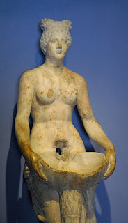 And on to the Bergama Museum. This is devoted to finds from the Pergamon area, particularly from the Acropolis and the Asklepieion, but also from a rescue dig carried out before the filling of the Yortanlı Dam outside the town, just below the Acropolis. Here we saw the original of the torso of Trajan we met up on the Acropolis, and a head of Alexander the Great (admittedly, a reproduction — the original is in Istanbul), a statue of a Nymph that was obviously part of a fountain, and a beautiful mosaic floor depicting a Medusa. Had a good close-up look at an Ionic capital. You so often see them depicted from directly in front, that you tend to forget that the sides of the 'coils' were inevitably decorated, usually with leaves, and most often the same acanthus leaves that so characterize Corinthian columns.