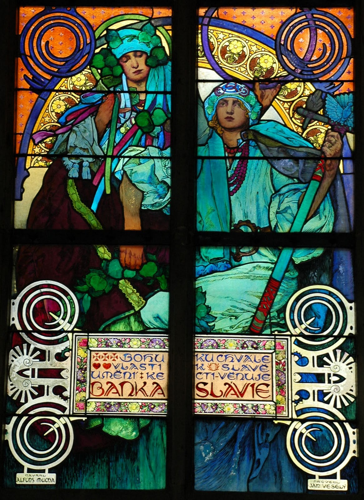 This is an old cathedral, but much of its decoration — especially its stained glass and its mosaics — are quite modern. There is a window designed by the Czech Art-Nouveau master Alphonse Mucha. I couldn't resist pointing you to a site containing his complete works — it's a treat for the eyes!
