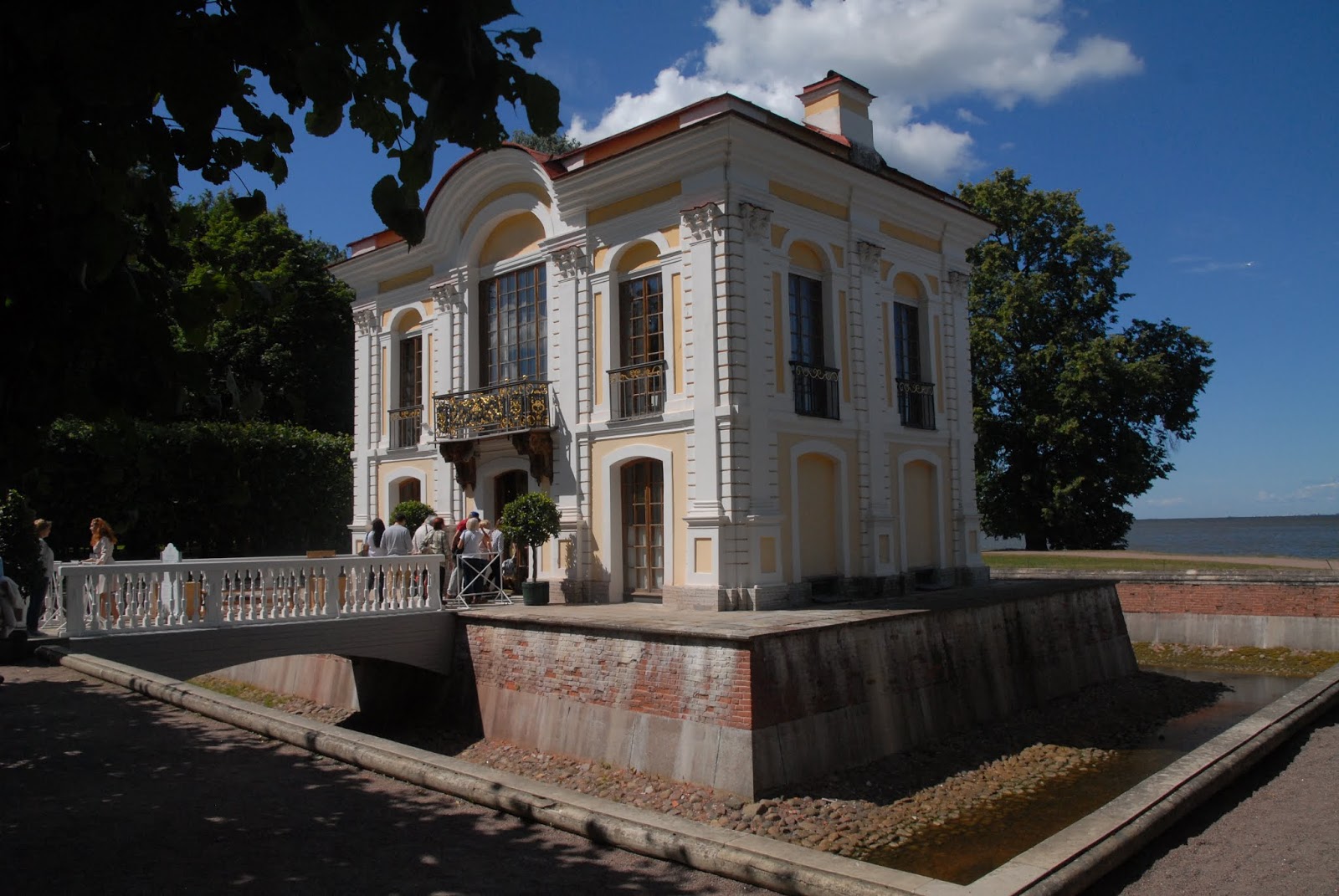 The other part of the gardens, although perhaps not a spectacular, are delightful. We wandered the leafy avenues, and as we reached the shoreline of the Gulf of Finland, we came across the Hermitage Pavilion, designed for the relaxation of the Emperor and his guests in 1725, it has a moat an upstairs room replete with paintings. We didn't go in — it wasn't open to the public that day — but we just marvelled at the exterior of this exquisite gem!